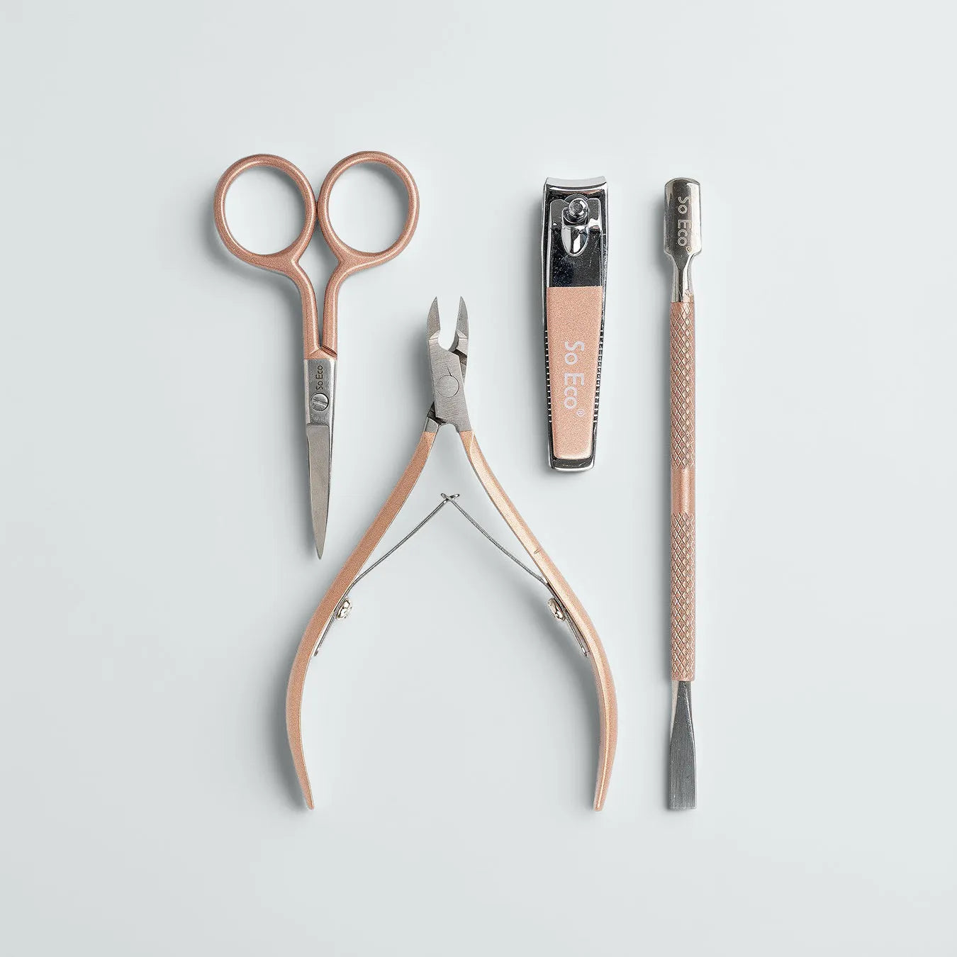 This set includes four essential items for a tidy manicure. Nail scissors for shaping. A nail clipper for quick trims. A cuticle nipper and pusher for gentle, precise care. Everything you need. Nothing you don’t.